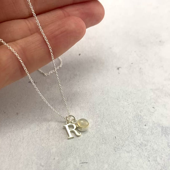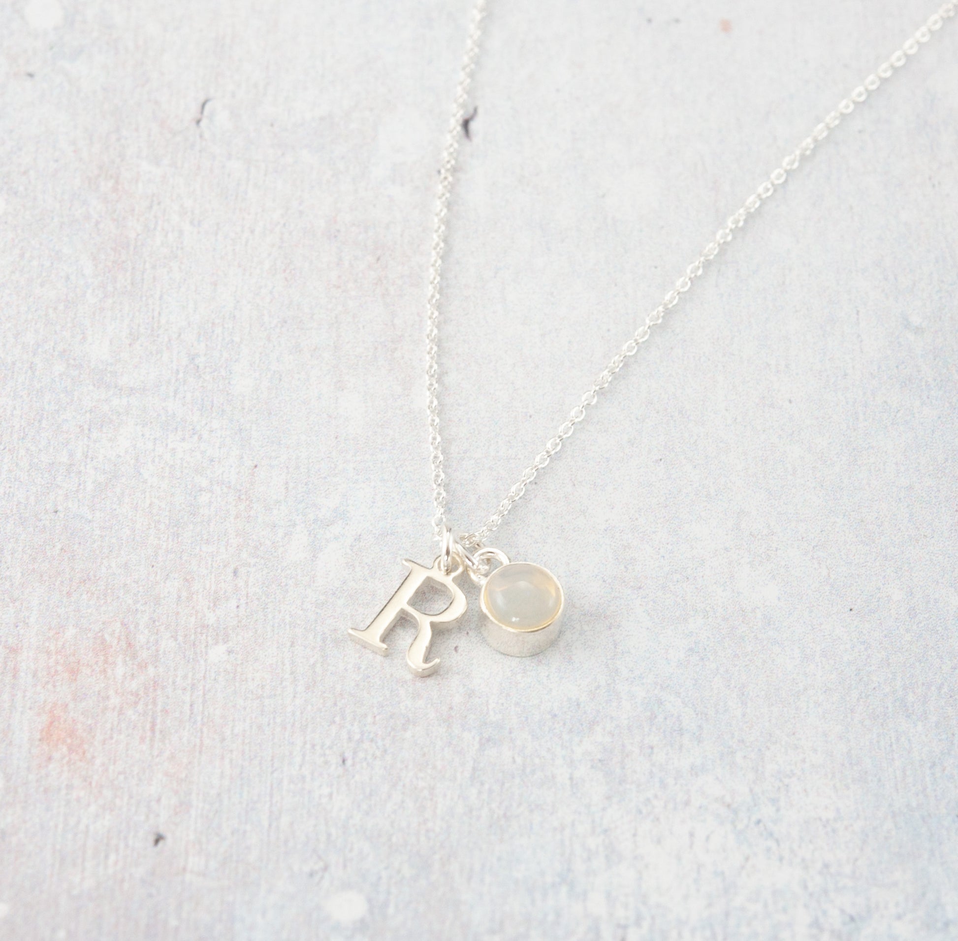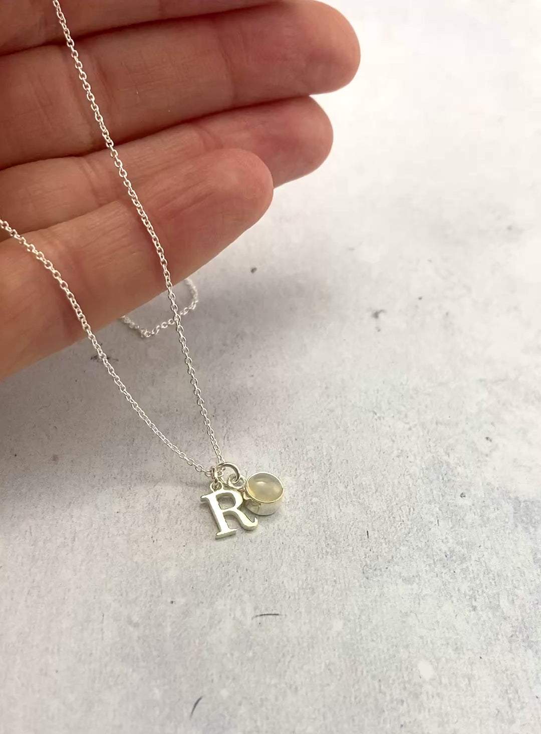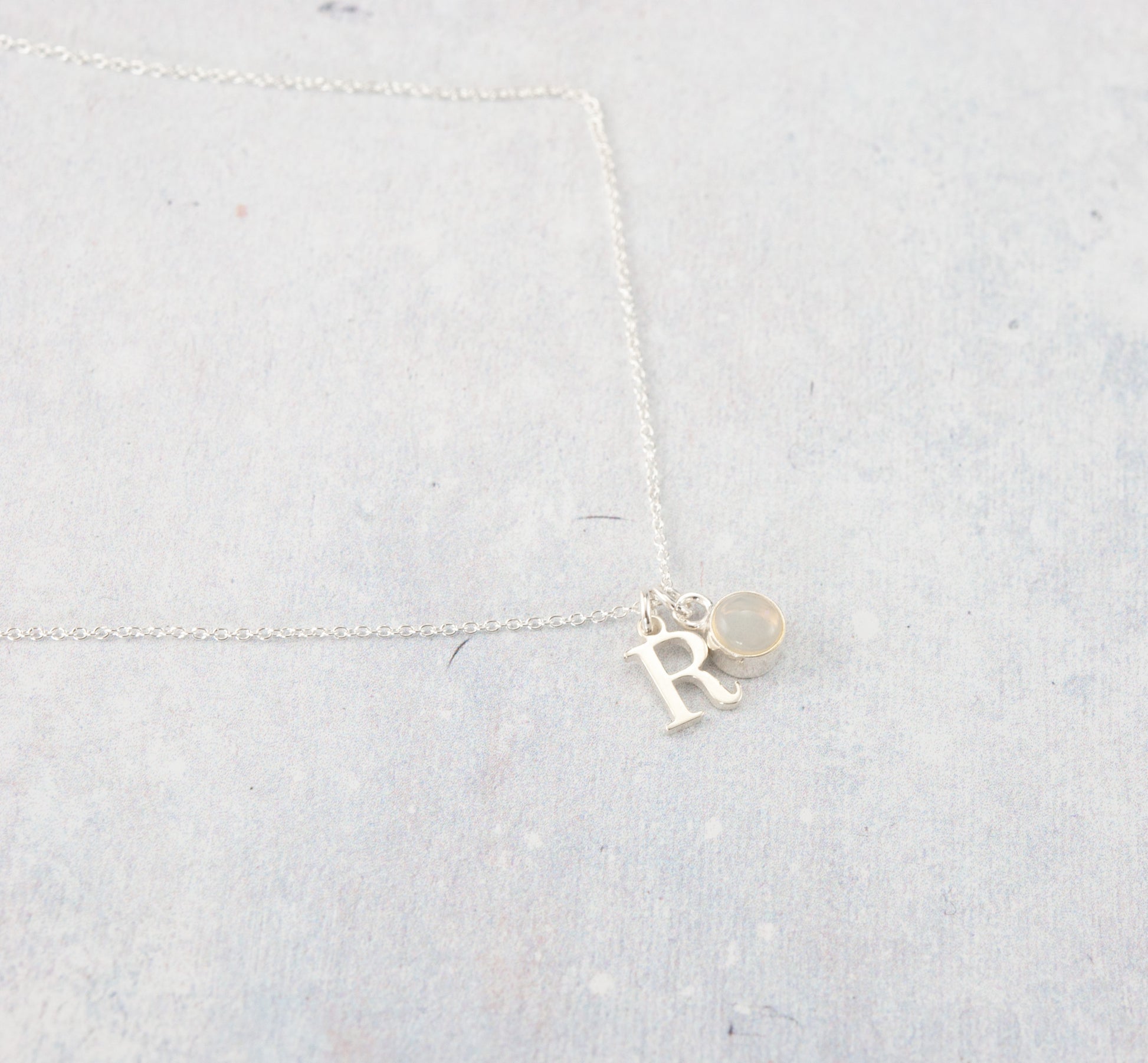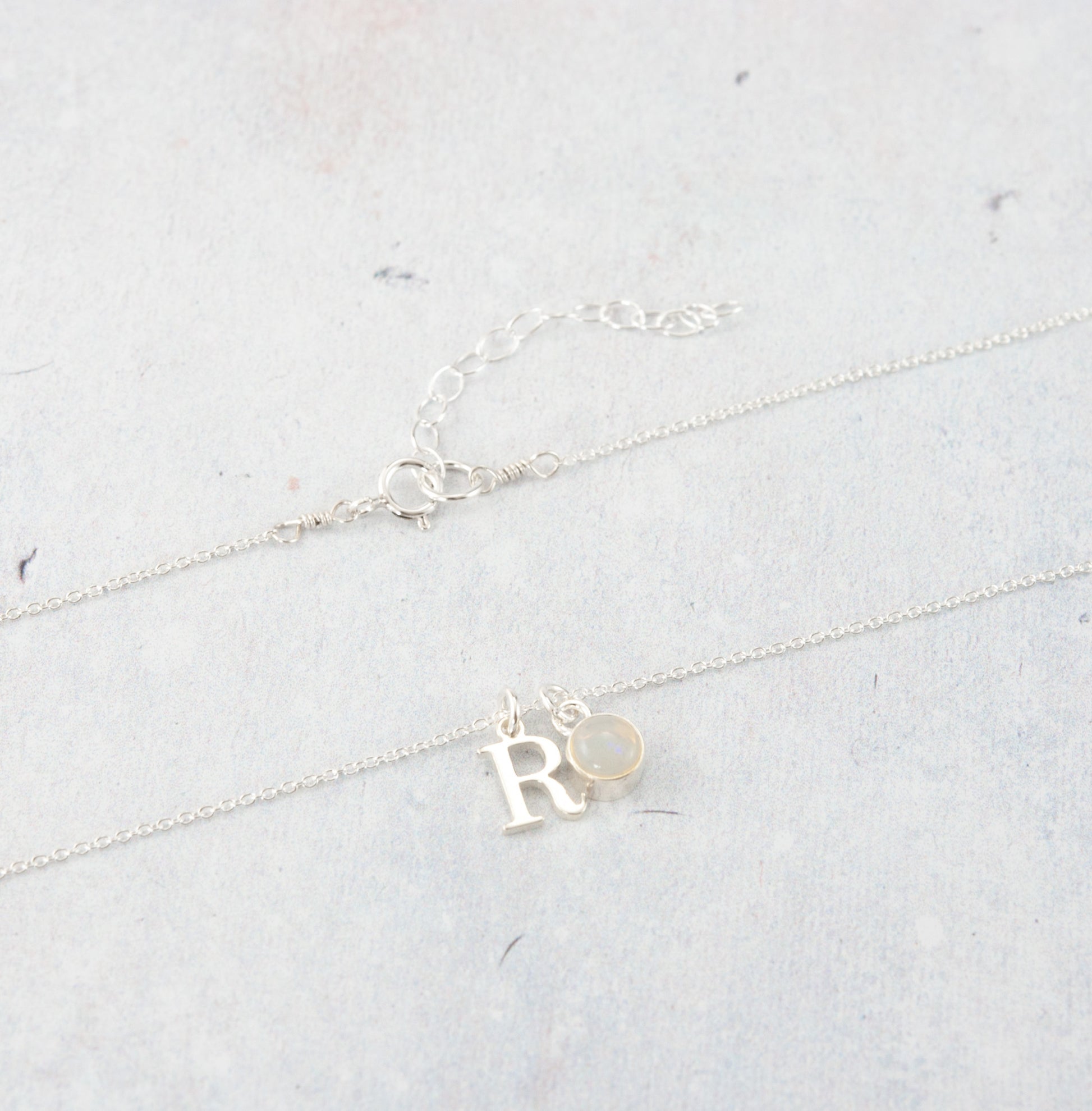 A highly personalised necklace with a genuine Opal gemstone birthstone charm and a 925 Sterling Silver letter threaded onto delicate 925 Sterling Silver chain. Delicate, dainty and pretty, this makes the perfect favourite everyday necklace, and a lovely personalised gift for anyone with a November birthday or who loves mysterious fiery Opal.
