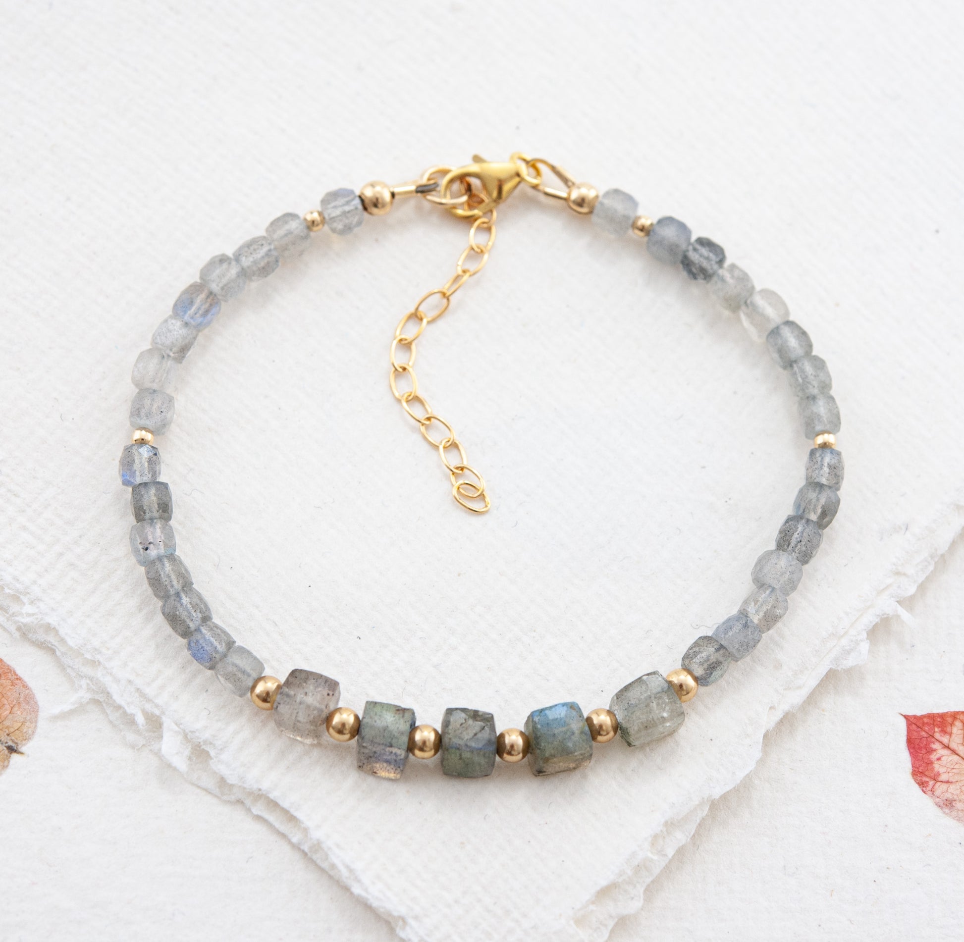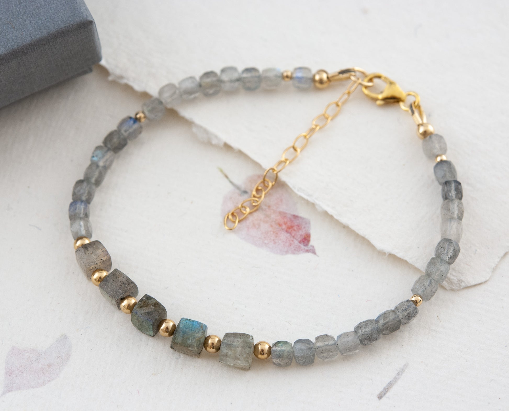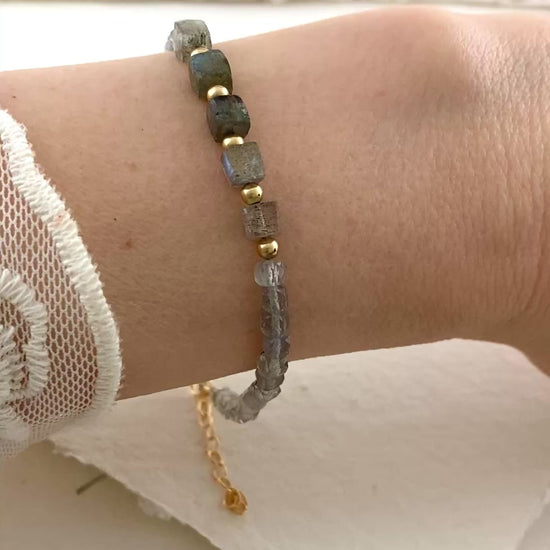 Natural Labradorite gemstone beads in a contemporary cube cut are surrounded by daintier Labradorite cubes and elevated by your choice of 14k Gold Fill or solid 925 Sterling Silver beads in this unusual and minimalist bracelet. Of excellent quality (Grade A), the stones are expertly faceted to create mesmerising sparkle as your wrist moves, and show plenty of the magical colourful flash for which this gemstone is so treasured.