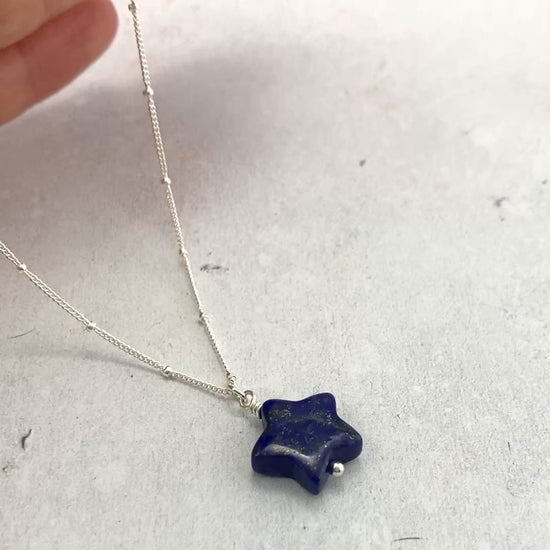 A royal blue Lapis Lazuli star gemstone is suspended from very fine beaded satellite chain, or simple fine chain in this pretty and elegant necklace. A piece of celestial beauty, with plenty of the glittering golden flecks of pyrite for which this gemstone is loved.