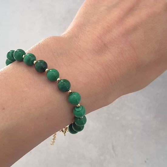 Natural Malachite gemstones have been polished smooth to highlight the beautiful natural green swirling patterns in this simple and elegant bracelet. The stones are interspersed with your choice of tiny 14k Gold Filled or 925 Sterling Silver beads