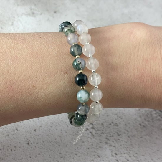 Beautiful natural Moss Agate gemstone beads are interspersed with your choice of tiny 925 Sterling Silver or 14k Gold Filled beads in this simple, elegant bracelet.