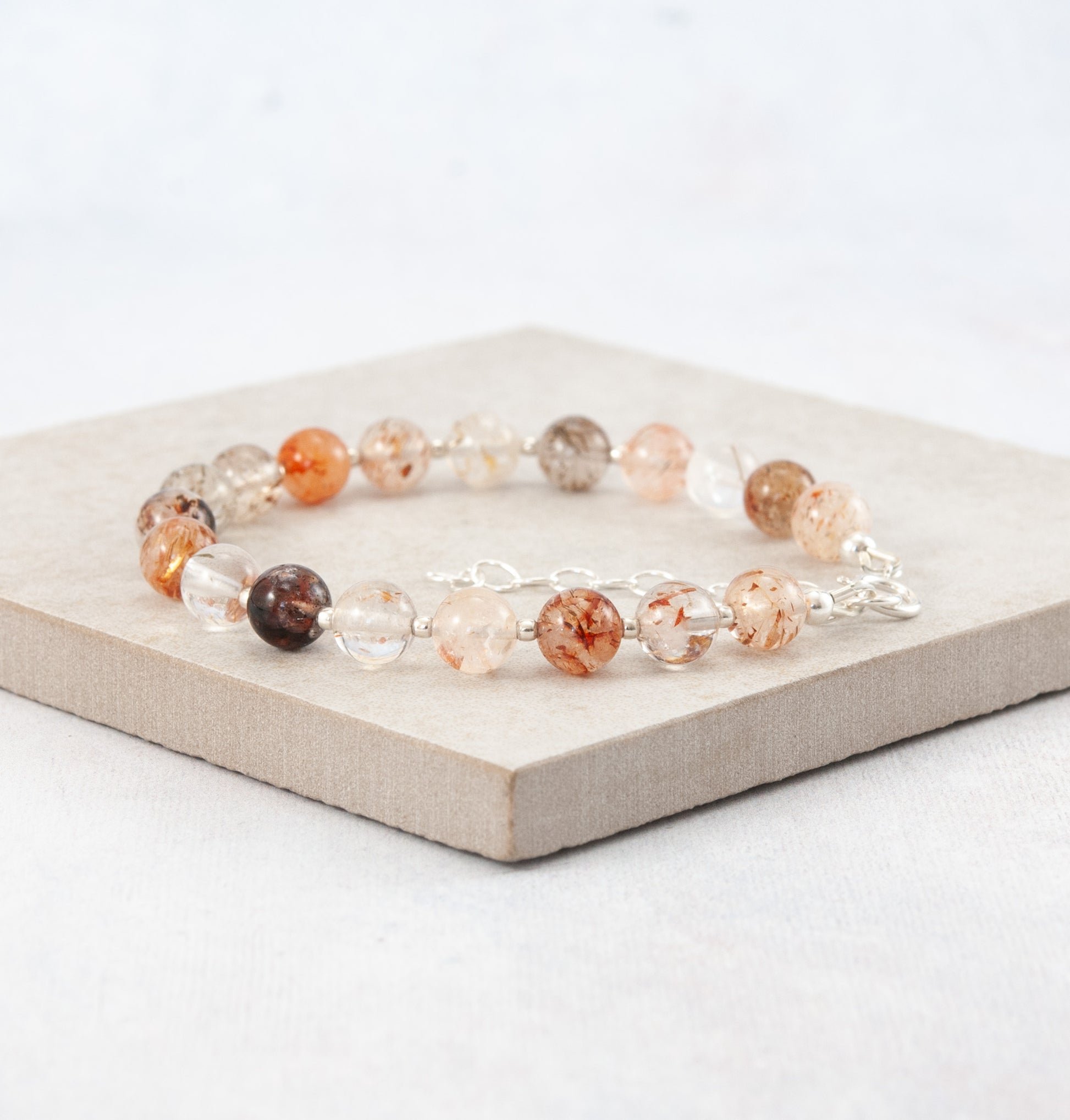 A fascinating bracelet featuring natural Multicolour Rutilated Quartz gemstone beads interspersed with your choice of tiny 925 Sterling Silver or 14k Gold Filled beads. These unusual and captivating gemstones have a crystal clear base with internal mineral inclusions in shades of copper, gold and black. Each gemstone is unique and the stones are beautifully glossy and cool to the touch.