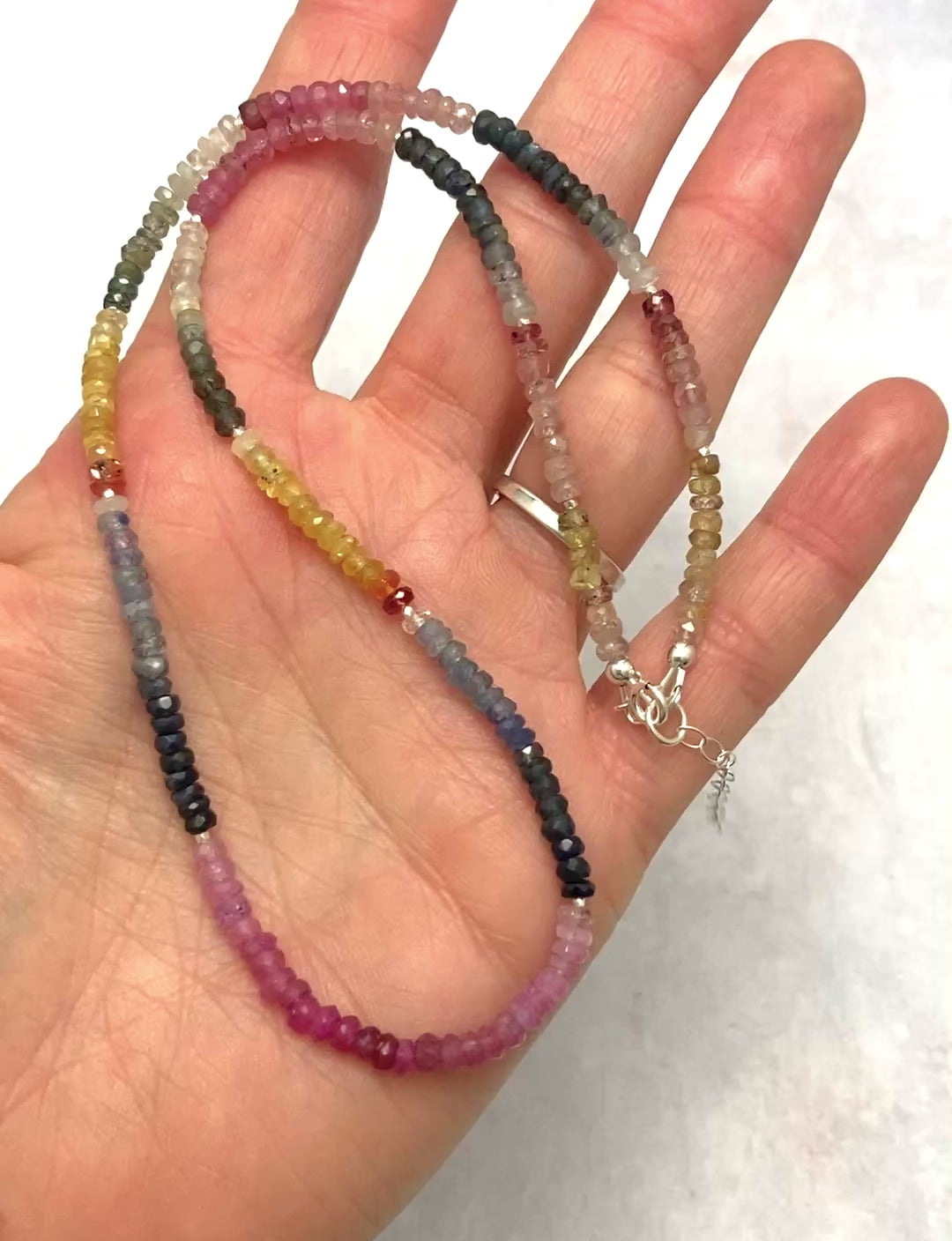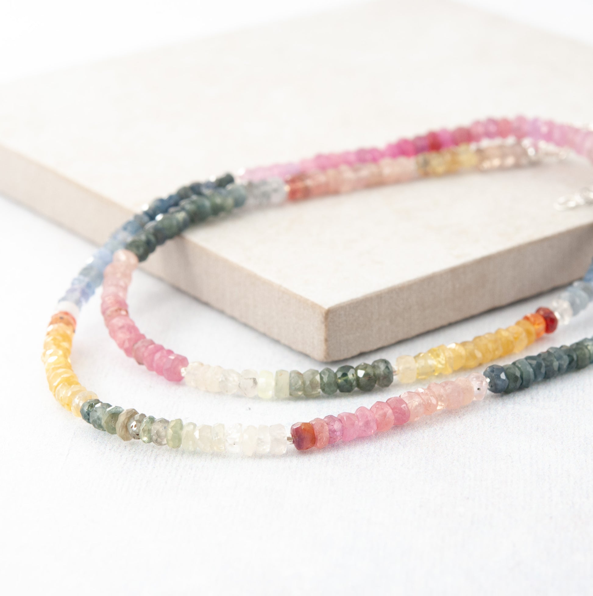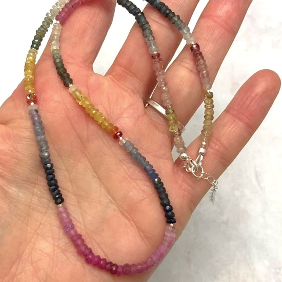 The Sapphire stones are micro faceted for mesmerising sparkle. They are completely natural and unenhanced, and are carefully arranged in ombre / shaded fashion. Sapphire is the traditional September birthstone and one of the world's best loved gemstones. Best known for its blues, it is also found in a range of colours, many of which appear in this necklace, including pink, green and yellow.