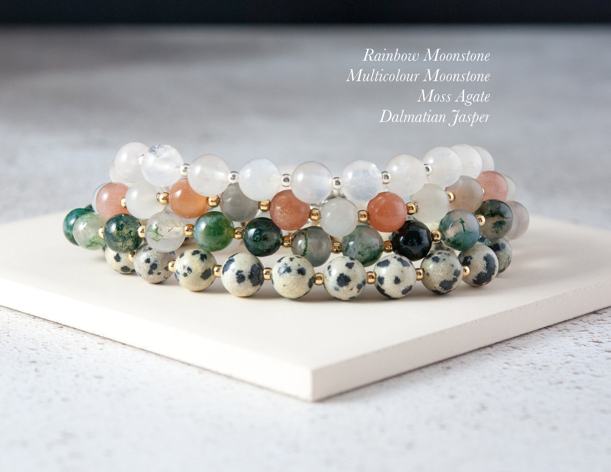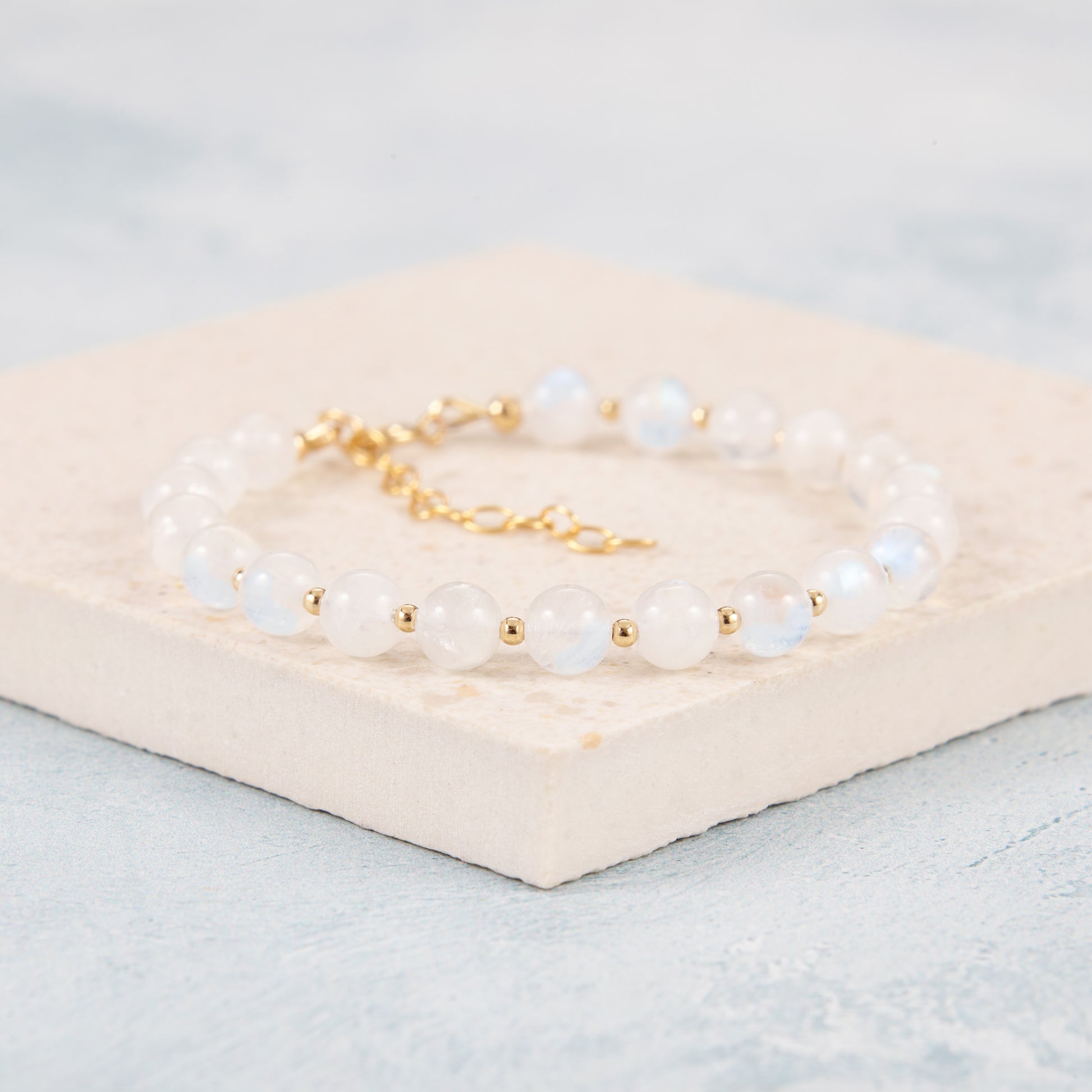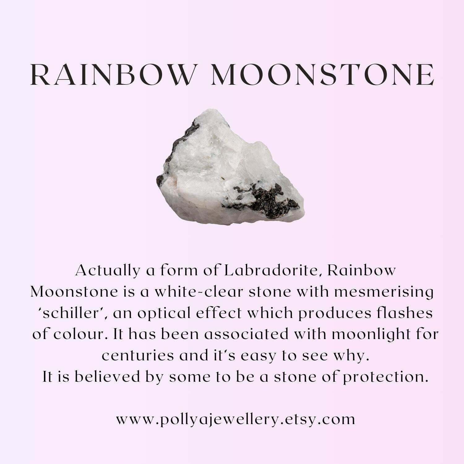 Beautiful natural Rainbow Moonstone gemstone beads are interspersed with your choice of tiny Sterling Silver or Gold Filled beads in this simple, elegant bracelet. June’s birthstone and actually a form of Labradorite, Rainbow Moonstone is a white-clear stone with mesmerising ‘schiller’, an optical effect which produces flashes of colour. It has been associated with moonlight for centuries and it’s easy to see why. It is believed by some to be a stone of protection.