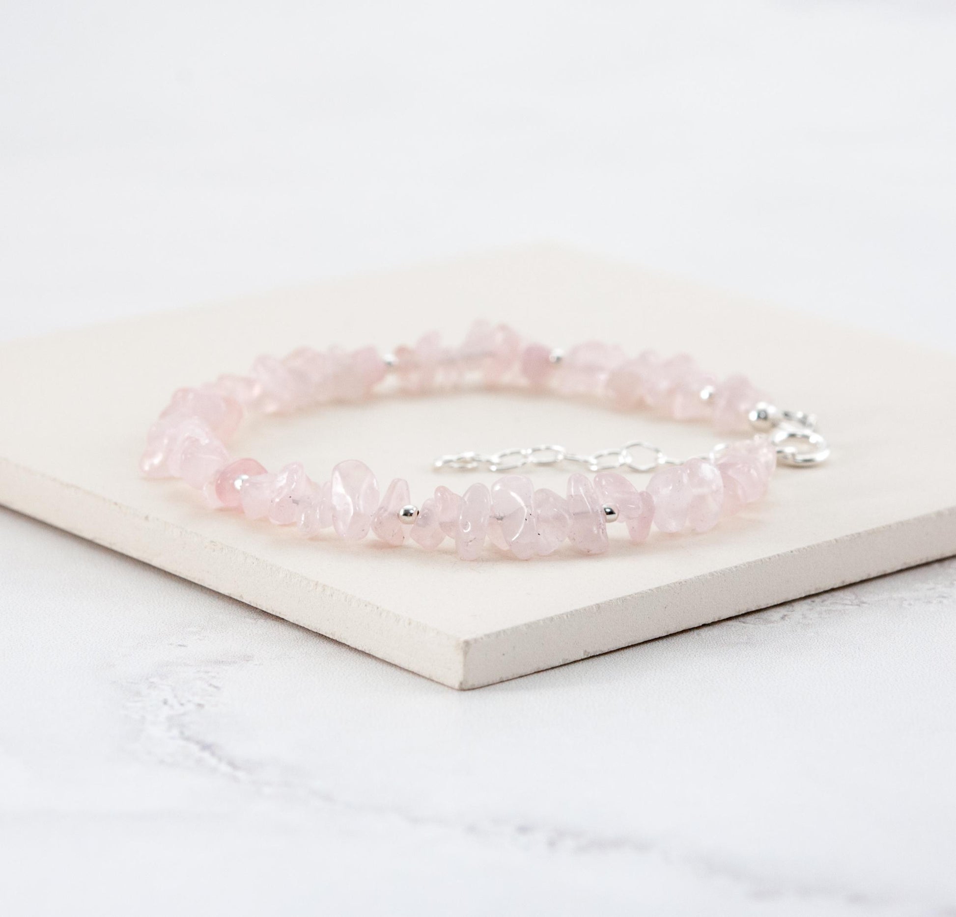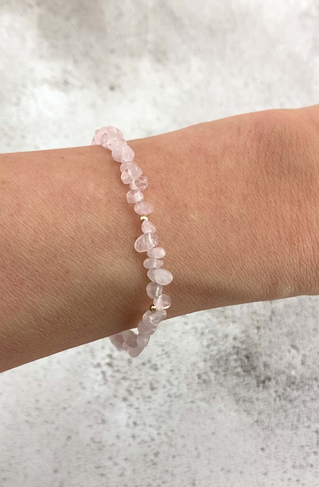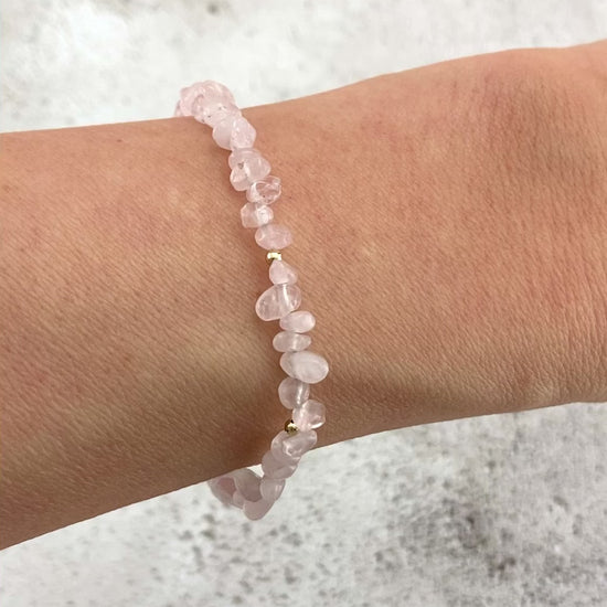 Soft pale pink Rose Quartz gemstone nugget beads are interspersed with your choice of tiny 14k Gold Filled or 925 Sterling Silver beads in this organic and natural looking little bracelet. Raw, rustic and completely natural, the chip & nugget shapes of the beads remind us that these gemstones are created by mother nature, whilst still delighting us with their soft pink colour and translucency. I have chosen the most dainty beads I could find to create a slender and elegant bracelet, perfect for wearing alone or stacking with other pieces.