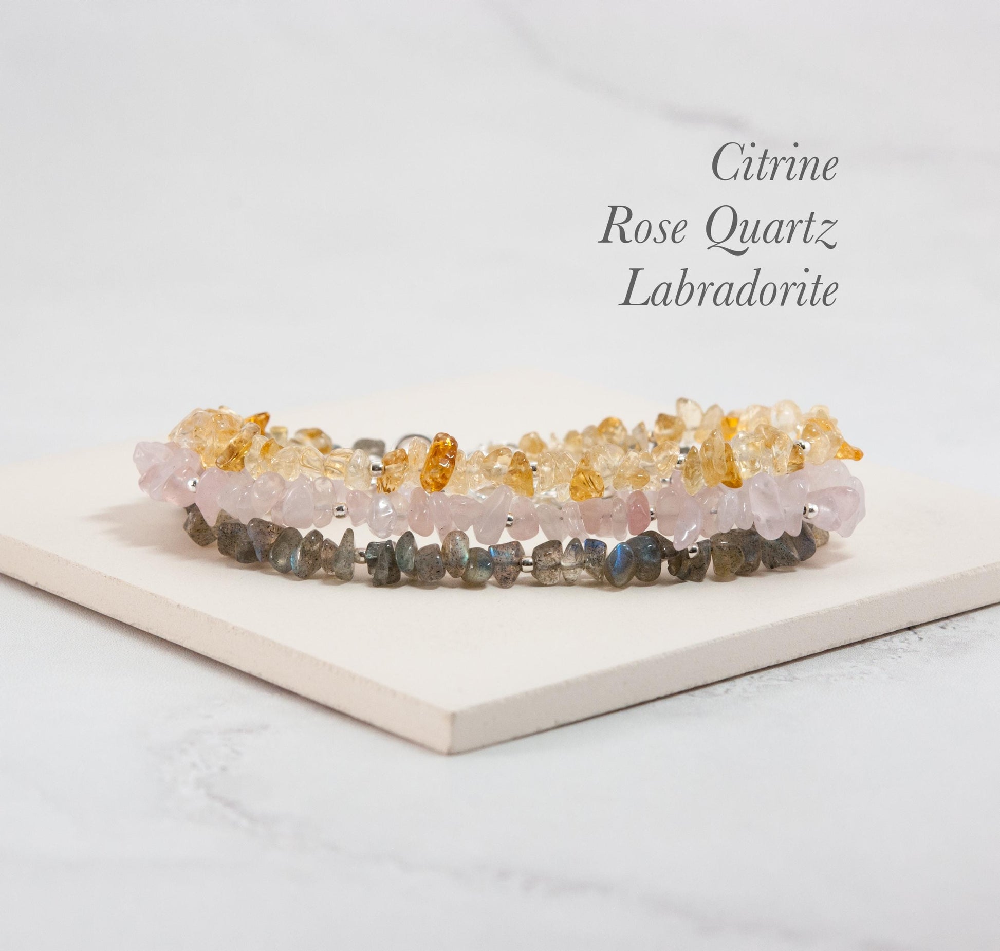 The clasp, findings and extension chain are all solid 925 Sterling Silver or 14k Gold Filled, and the beads are strung on very fine and flexible but strong jewellery wire, making the bracelet strong and durable.