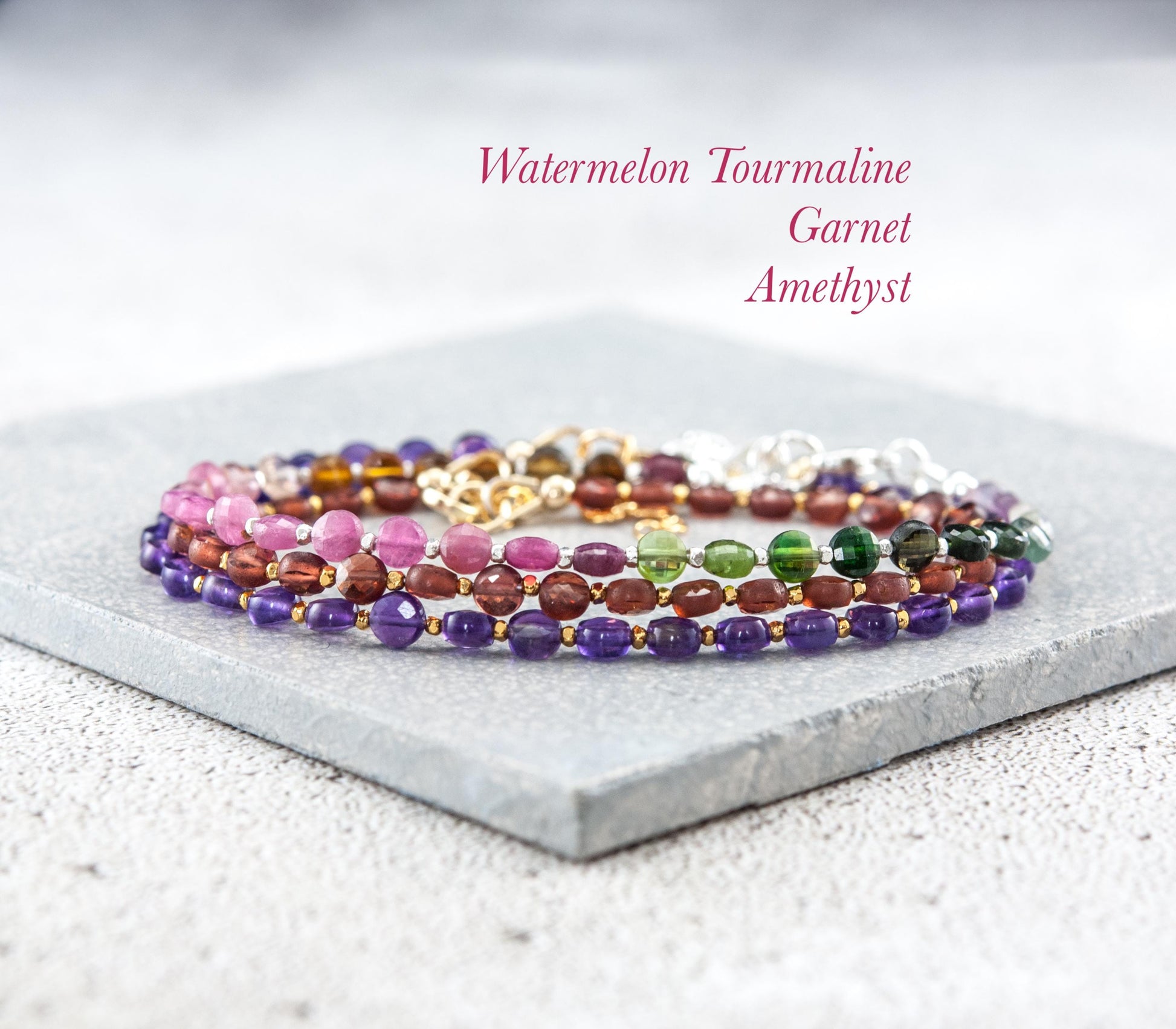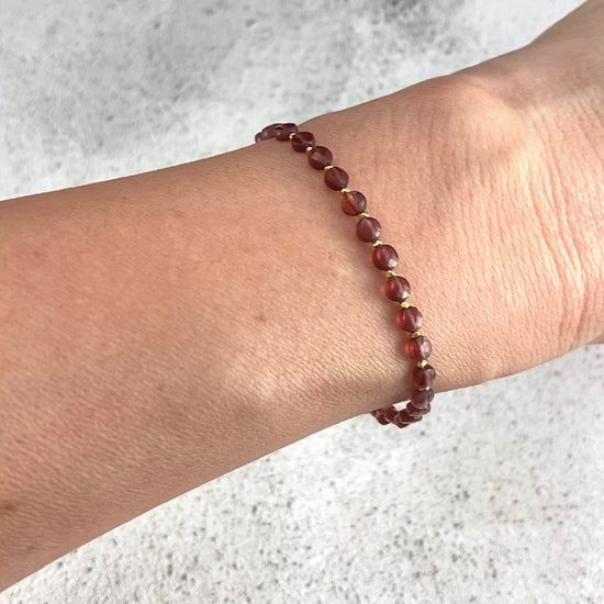 Garnet gemstone beads in a sweet little coin-shaped cut are interspersed with your choice of tiny Sterling Silver or Gold Vermeil beads in this delicate and dainty bracelet. These gemstones are of excellent quality, Grade AAA, with great clarity, a lovely red colour, and expert micro faceting for ultimate sparkle.
