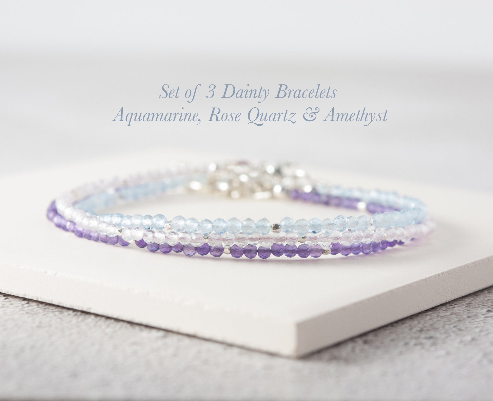 Set of 3 Dainty Gemstone Bracelets - Rose Quartz, Aquamarine & Amethyst