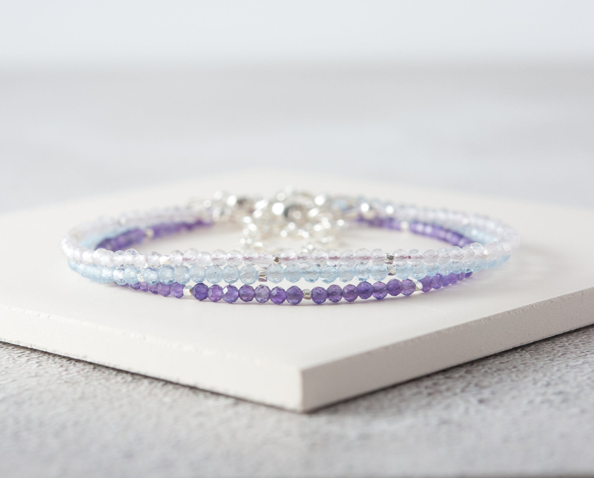 A set of 3 favourite dainty gemstone bracelets; pale pink Rose Quartz, rich purple Amethyst and mermaid-blue Aquamarine, at a more affordable price than when bought separately. These tiny gemstones are of fantastic quality, are faceted for excellent sparkle. They are interspersed with your choice of Gold Vermeil or Sterling Silver beads.