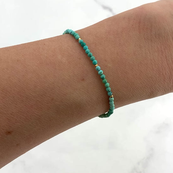 Tiny genuine Sleeping Beauty Turquoise gemstones are arranged in ombre style from blue - green shades in this slender and elegant little bracelet. The stones are micro faceted for lovely light-catching twinkle as the bracelet moves, and are interspersed with your choice of Gold Vermeil or Sterling Silver tiny beads.