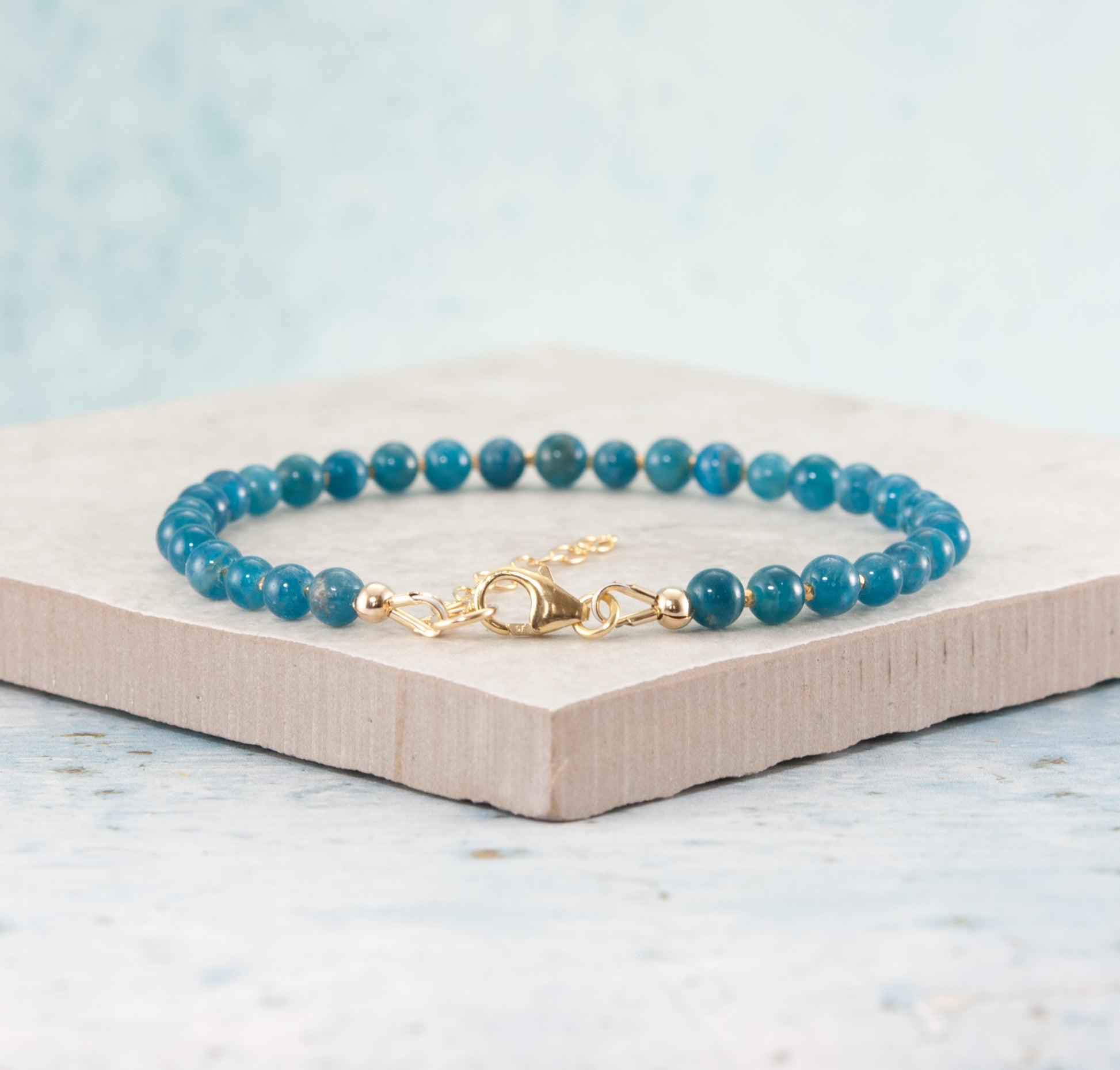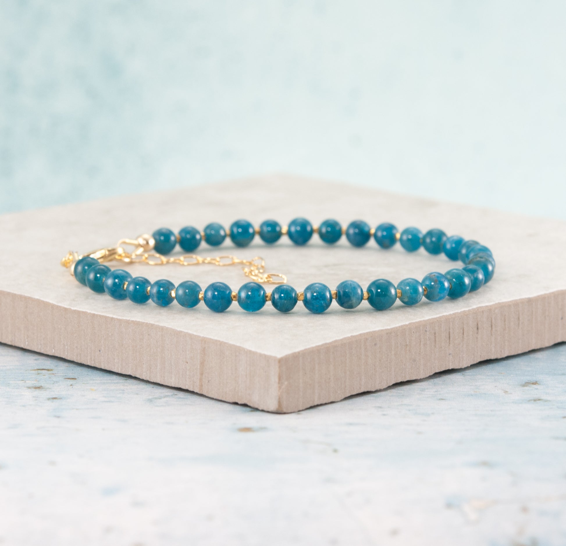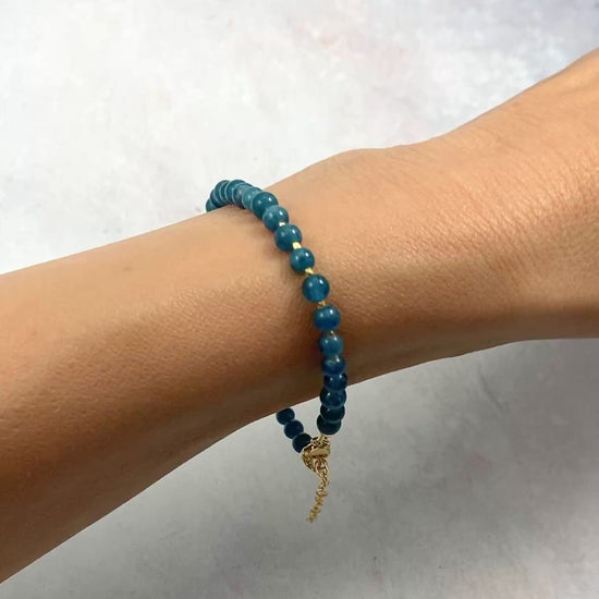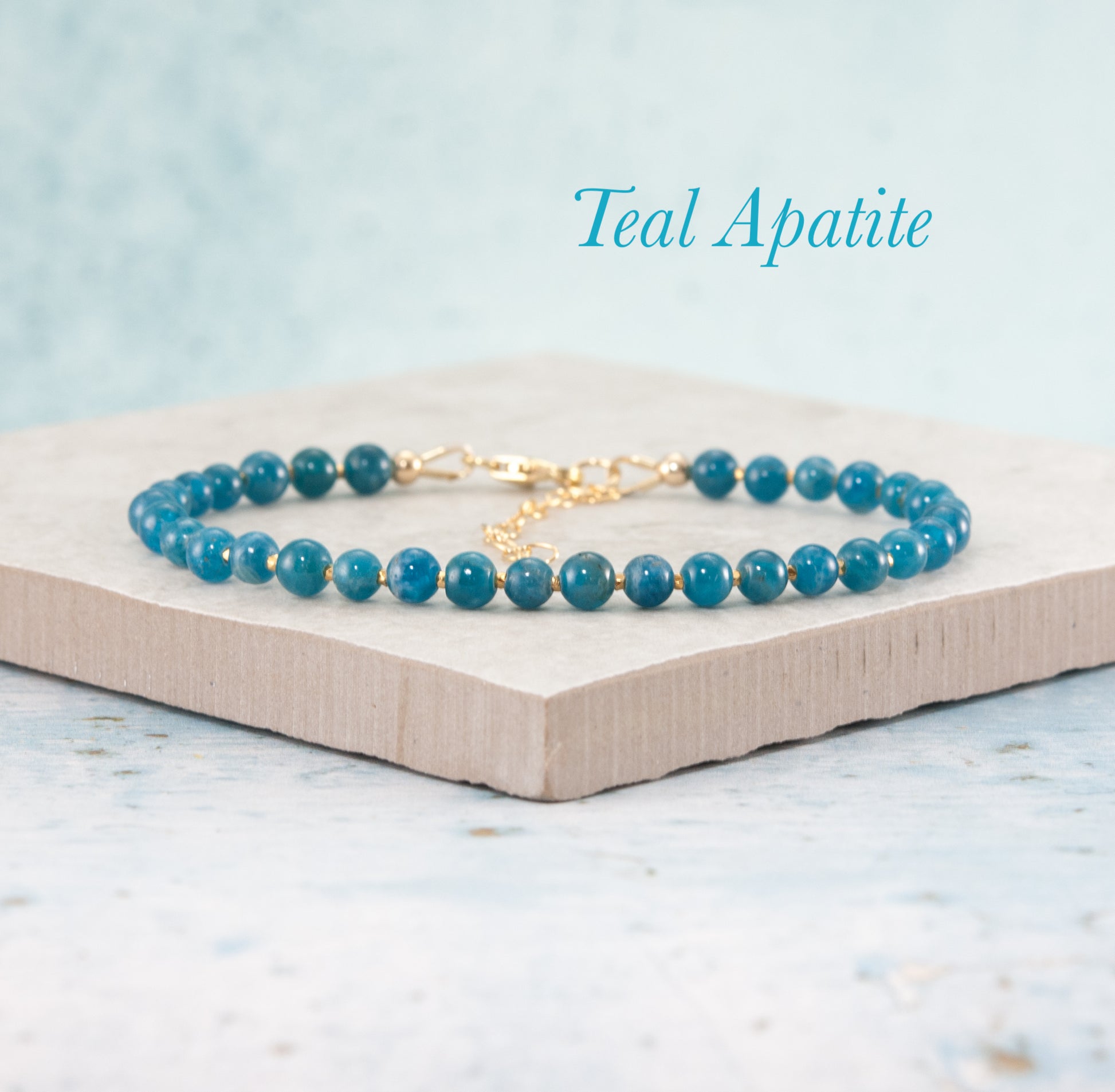 Beautiful Apatite gemstone beads in a stunning shade of teal are interspersed with your choice of Sterling Silver or Gold Vermeil beads in this simple but vivid bracelet.
