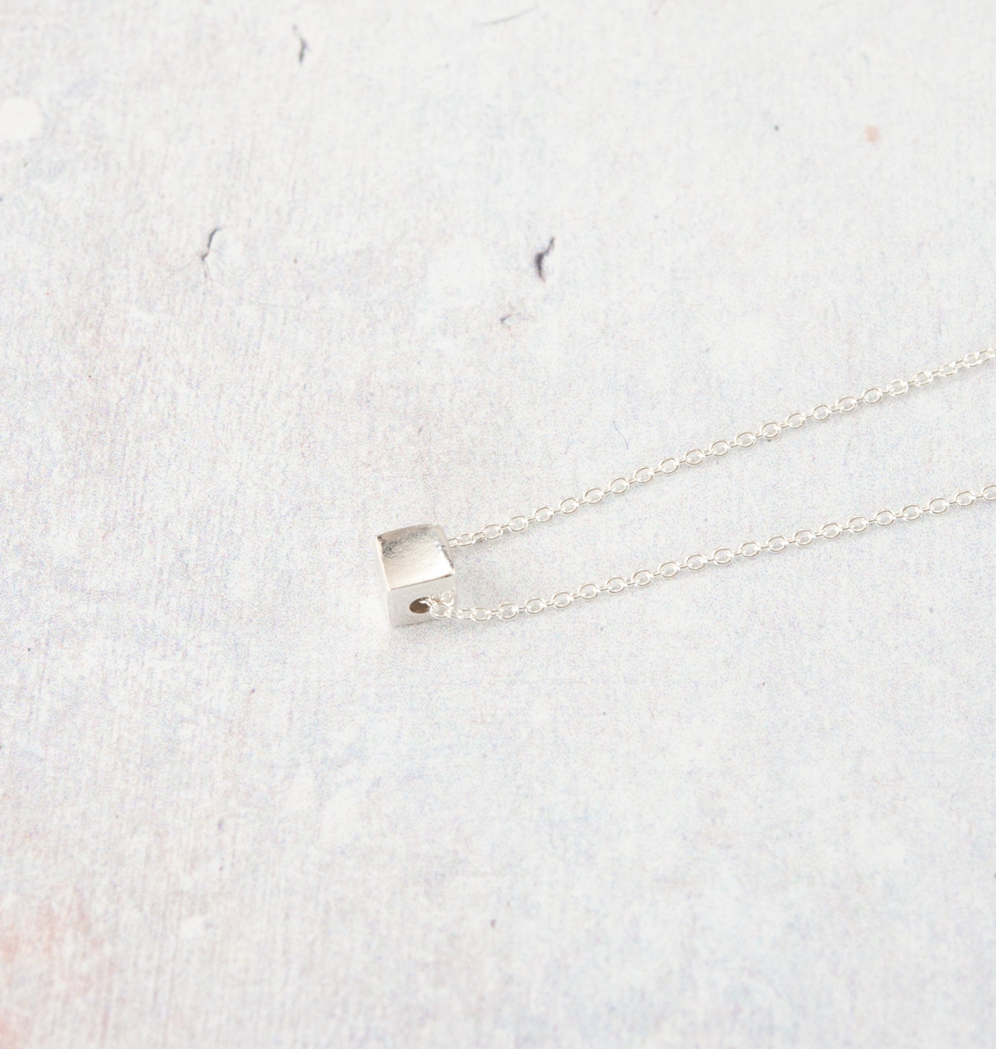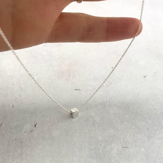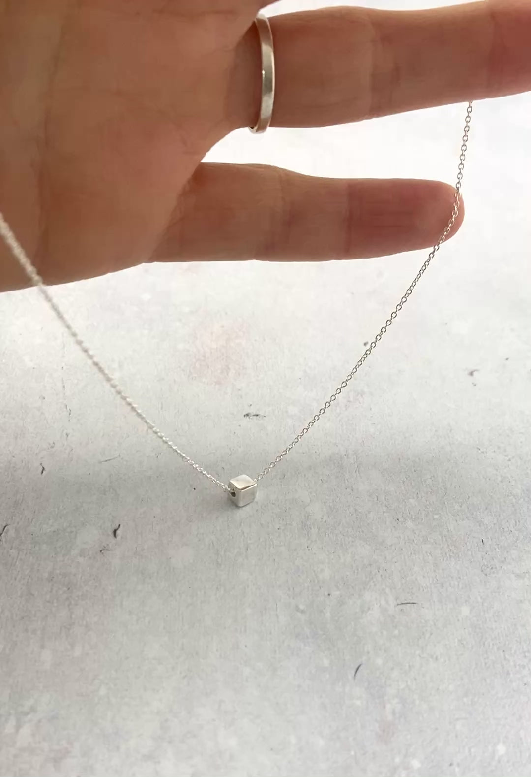 A very minimalist and dainty necklace featuring a tiny solid 925 Sterling Silver cube threaded onto fine, delicate Sterling Silver chain. Perfect for everyday wear.