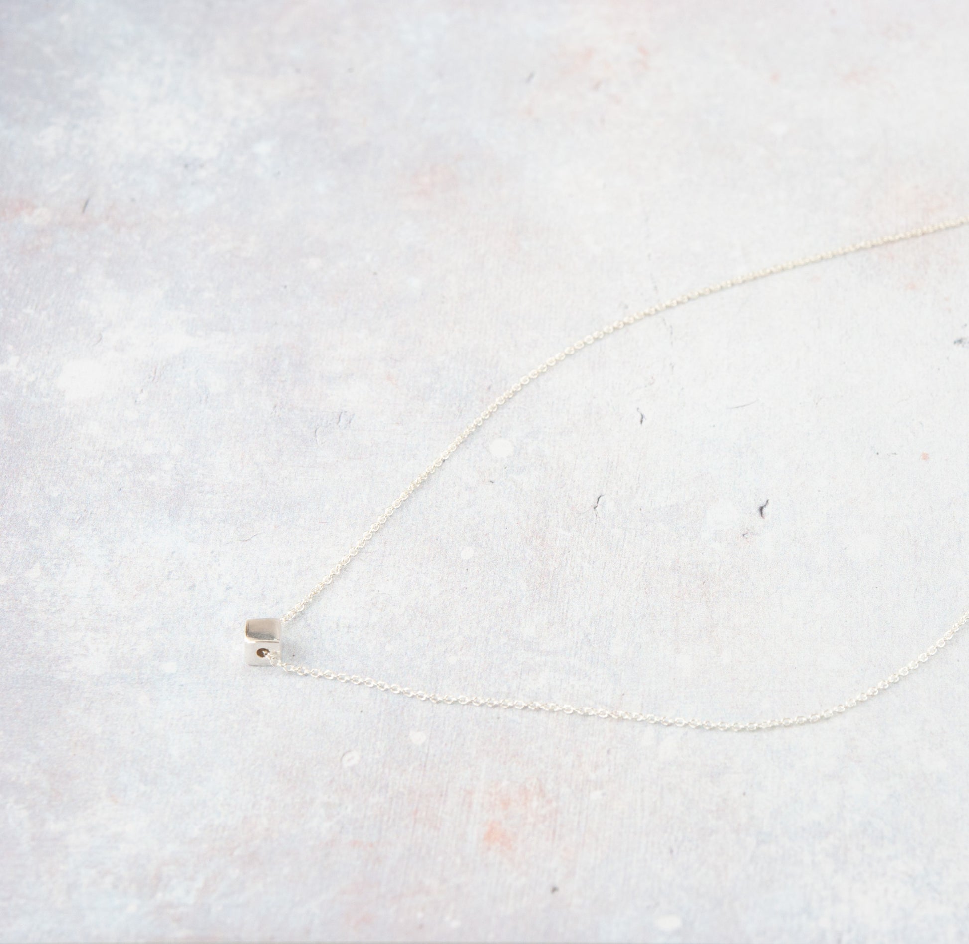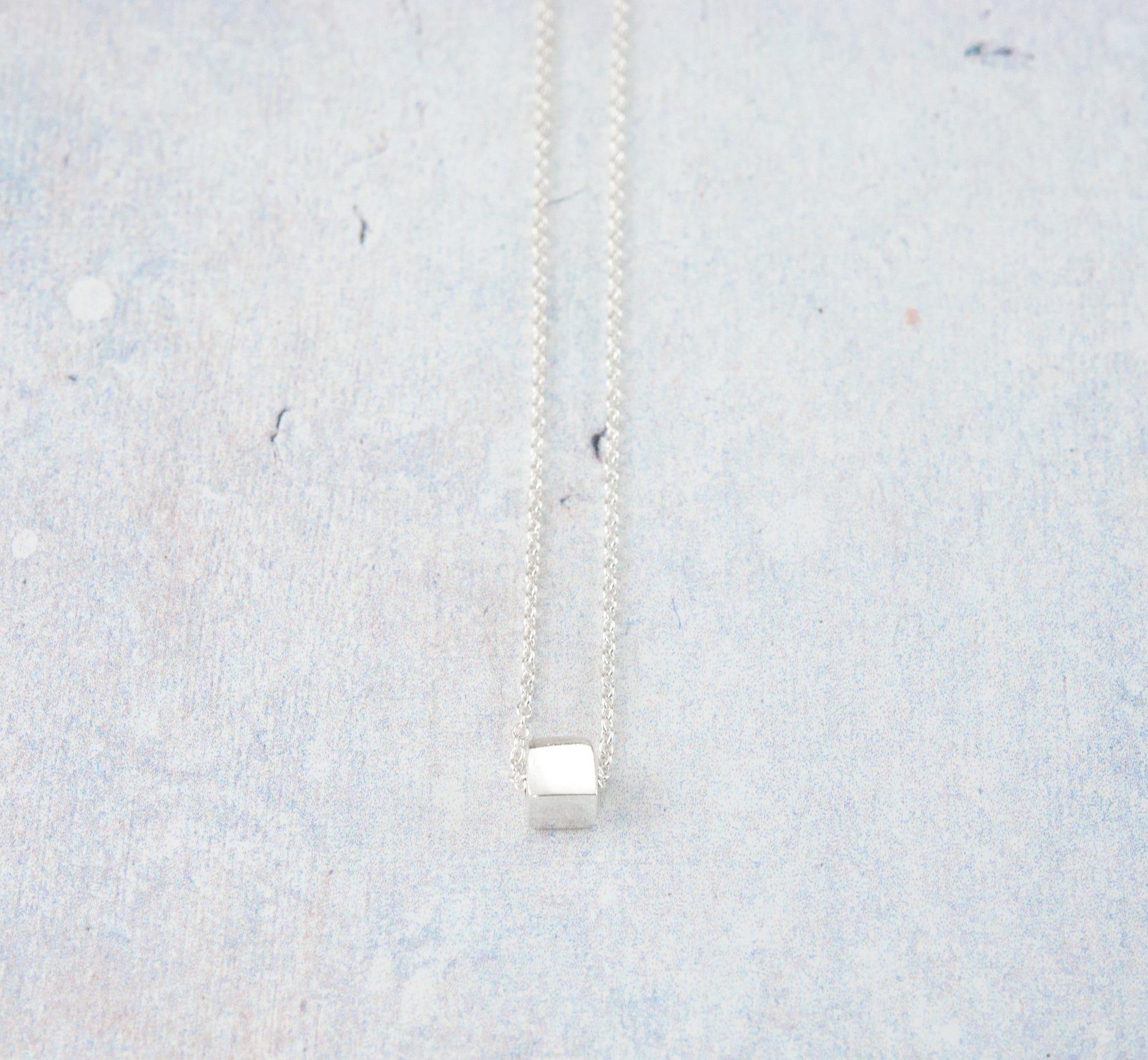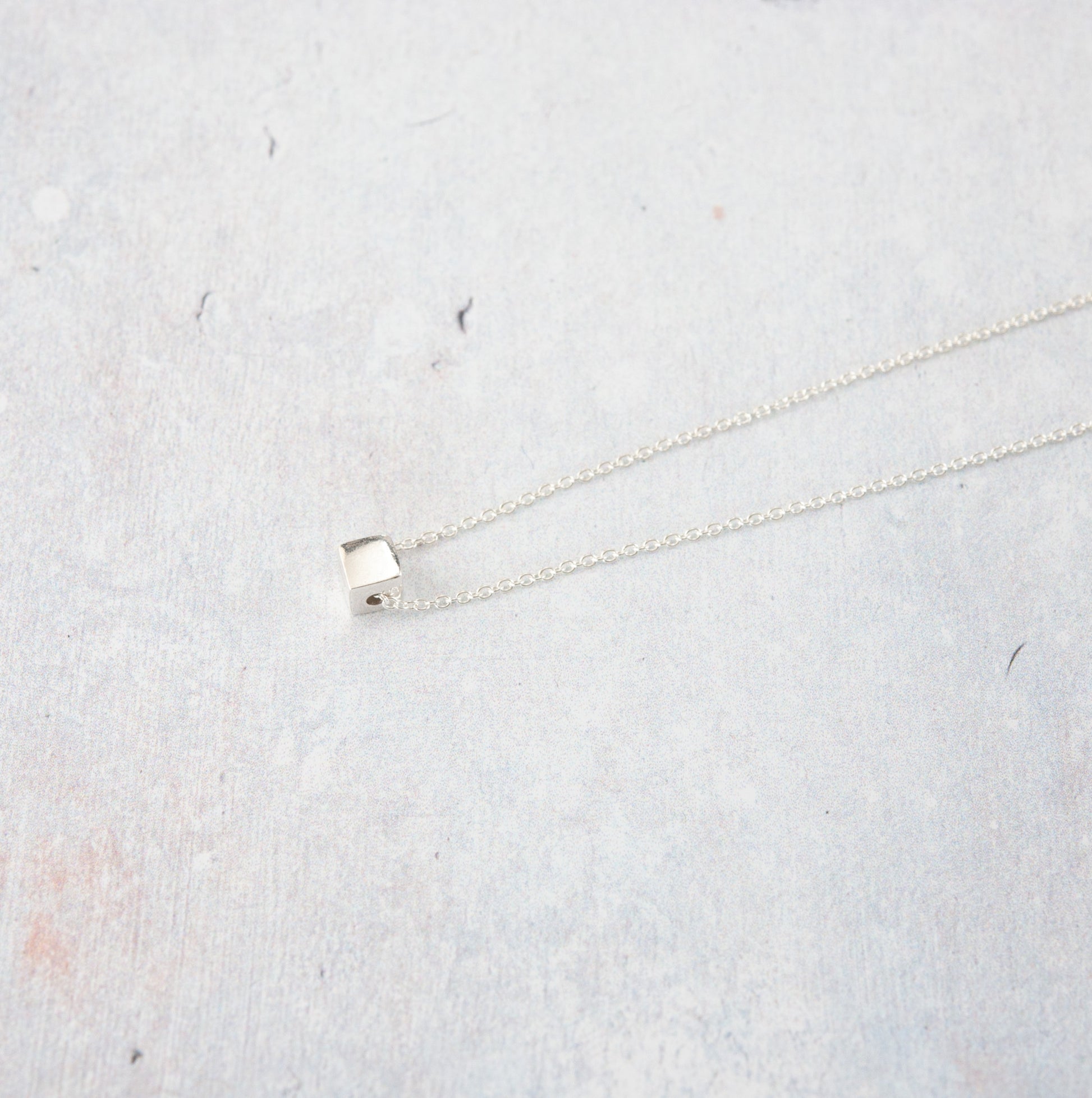 A very minimalist and dainty necklace featuring a tiny solid 925 Sterling Silver cube threaded onto fine, delicate Sterling Silver chain. Perfect for everyday wear.